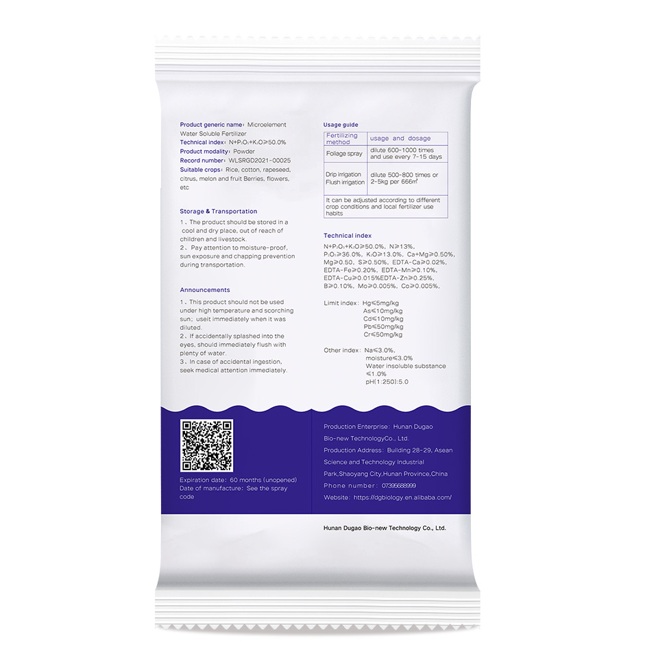 Hunan Dugao Bio-new Technology Co., Ltd. was founded in 2008, and was initiated by senior people in China's agricultural sector. Its production base was located in Shaoyang Asean Science and Technology Industrial Park, which covers an area of more than 10,000 square meters. We are mainly engaged in the production and marketing of special water-soluble fertilizers for modern agricultural applications. Our mission is to apply special water-soluble fertilizers to agriculture, promoting precision fertilization technology, achieving high yield and high yield. We have a professional R & D team, advanced production equipment, international top fertilizer production technology and high quality service team. Our products are technically ahead of the water-soluble fertilizer industry, which can solve the problem of farmers' fertilization more effectively. With years of development, our company has accumulated rich production experience and become one of the leading enterprises in China's special water-soluble fertilizer industry.
