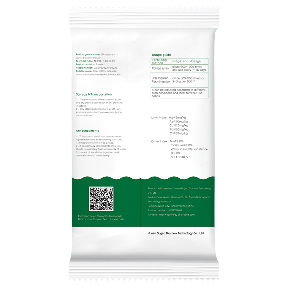 Hunan Dugao Bio-new Technology Co., Ltd. was founded in 2008, and was initiated by senior people in China's agricultural sector. Its production base was located in Shaoyang Asean Science and Technology Industrial Park, which covers an area of more than 10,000 square meters. We are mainly engaged in the production and marketing of special water-soluble fertilizers for modern agricultural applications. Our mission is to apply special water-soluble fertilizers to agriculture, promoting precision fertilization technology, achieving high yield and high yield. We have a professional R & D team, advanced production equipment, international top fertilizer production technology and high quality service team. Our products are technically ahead of the water-soluble fertilizer industry, which can solve the problem of farmers' fertilization more effectively. With years of development, our company has accumulated rich production experience and become one of the leading enterprises in China's special water-soluble fertilizer industry.
