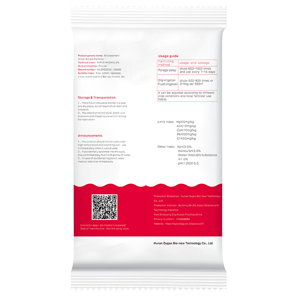 Hunan Dugao Bio-new Technology Co., Ltd. was founded in 2008, and was initiated by senior people in China's agricultural sector. Its production base was located in Shaoyang Asean Science and Technology Industrial Park, which covers an area of more than 10,000 square meters. We are mainly engaged in the production and marketing of special water-soluble fertilizers for modern agricultural applications. Our mission is to apply special water-soluble fertilizers to agriculture, promoting precision fertilization technology, achieving high yield and high yield. We have a professional R & D team, advanced production equipment, international top fertilizer production technology and high quality service team. Our products are technically ahead of the water-soluble fertilizer industry, which can solve the problem of farmers' fertilization more effectively. With years of development, our company has accumulated rich production experience and become one of the leading enterprises in China's special water-soluble fertilizer industry.
