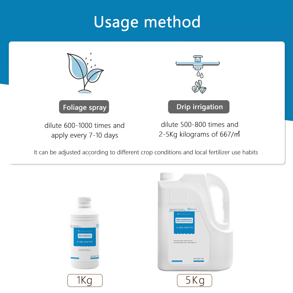 High phosphate potassium fertilizer, especially added EDTA zinc, boron, promote flower bud differentiation, robust flowers, swelling,sweetening and coloring fruit